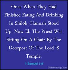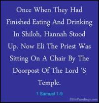 Hannah’s Prayer. 9 Hannah rose after one such meal at Shiloh, and presented herself before the LORD; at the time Eli the priest was sitting on a chair near the doorpost of the LORD’s temple. 10 In her bitterness she prayed to the LORD, weeping freely, 11 and made this vow: “O LORD of hosts, if you look with pity on the hardship of your servant, if you remember me and do not forget me, if you give your handmaid a male child, I will give him to the LORD all the days of his life. No razor shall ever touch his head.” 12 As she continued praying before the LORD, Eli watched her mouth, 13 for Hannah was praying silently; though her lips were moving, her voice could not be heard. Eli, thinking she was drunk, 14 said to her, “How long will you make a drunken spectacle of yourself? Sober up from your wine!” 15 “No, my lord!” Hannah answered. “I am an unhappy woman. I have had neither wine nor liquor; I was only pouring out my heart to the LORD. 16 Do not think your servant a worthless woman; my prayer has been prompted by my deep sorrow and misery.” 17 Eli said, “Go in peace, and may the God of Israel grant you what you have requested.” 18 She replied, “Let your servant find favor in your eyes,” and left. She went to her quarters, ate and drank with her husband, and no longer appeared downhearted. 19 Early the next morning they worshiped before the LORD, and then returned to their home in Ramah. When they returned Elkanah had intercourse with his wife Hannah, and the LORD remembered her.
