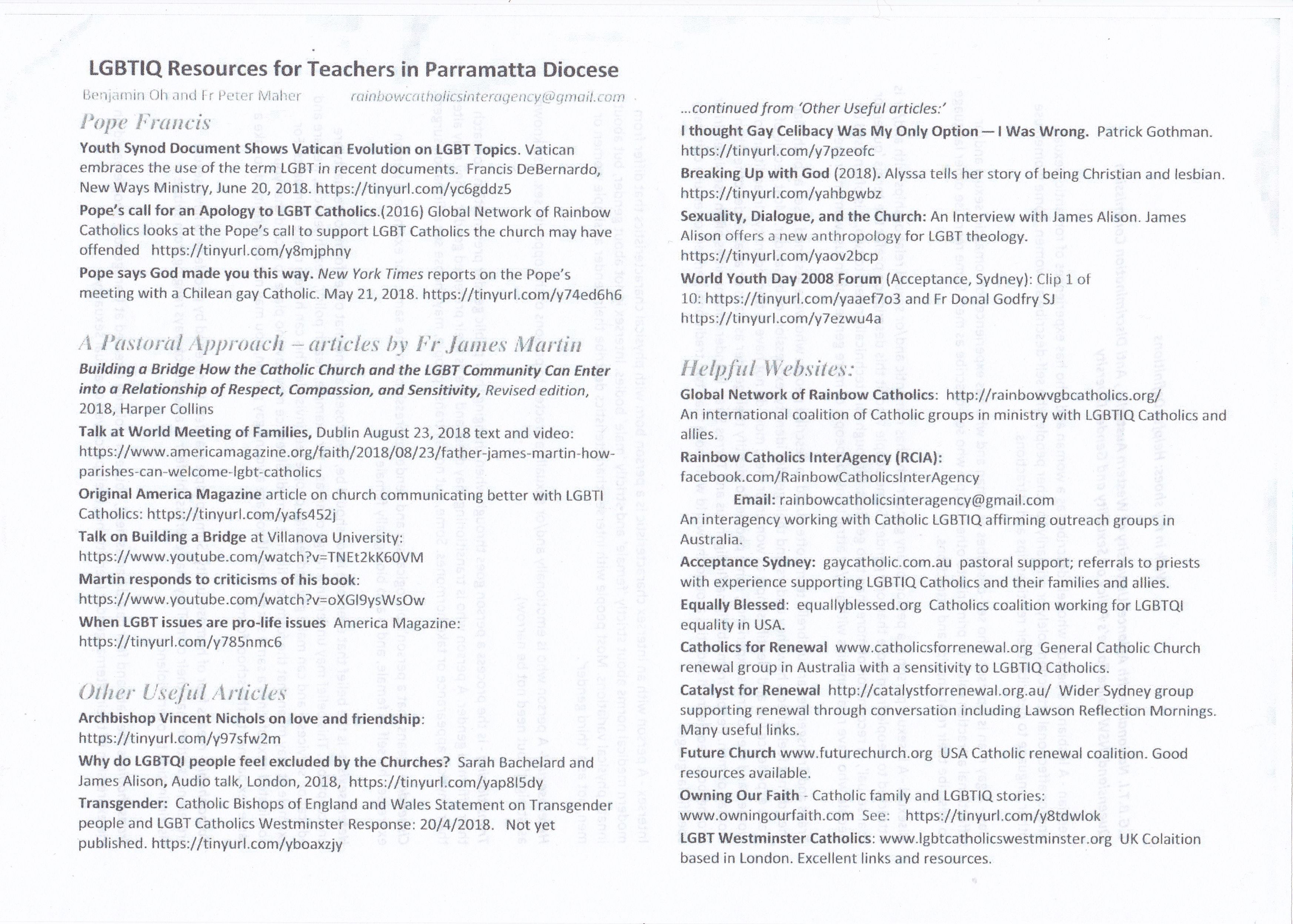 Catholic Teachings “from the Magisterium” (which the Catholic Education Office and the Vicar General – Rev. Chris De Souza – have hastened to reassure parents with) includes the article “Pope says God made you this way”; Pope’s Call to Apology for LGBTQI Catholics; Youth Synod document on Evolution of church on LGBTQI topics.